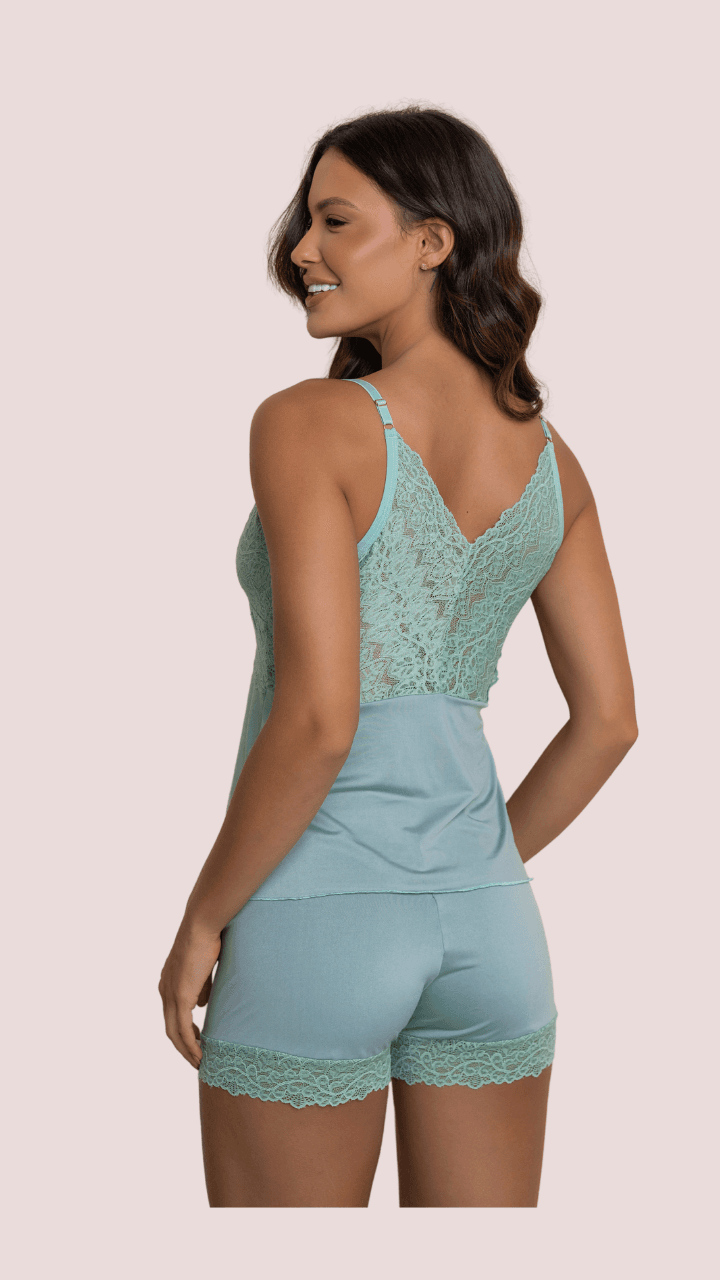 Baby Doll em microfibra. Deixe sua noite de sono ainda mais aconchegante. Pijama de blusa com alças e shorts com aplicação em renda Aplicações em renda, recortes que valorizam as curvas do decote, busto e barras do shorts Aplicação de laço Consulte a cartela de cores e a tabela de tamanhos disponíveis. Entre em contato com o seu consultor de vendas e finalize o seu pedido!