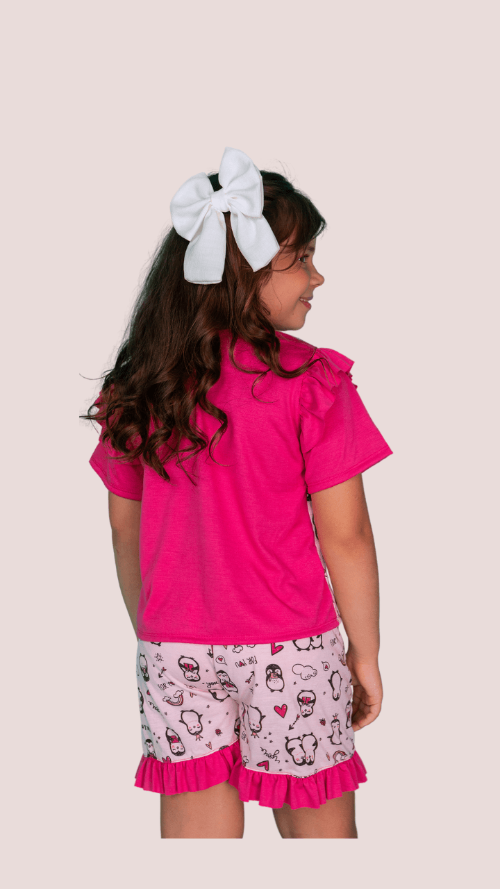 Conjunto de blusa e short em tecido PV. Deixe a noite de sono da sua pequena ainda mais aconchegante. Peças com babado aplicado Combinação de cor lisa e estampa Composição: 65% poliéster, 35% viscose Consulte a cartela de cores/estampa e a tabela de tamanhos disponíveis. Entre em contato com o seu consultor de vendas e finalize o seu pedido!