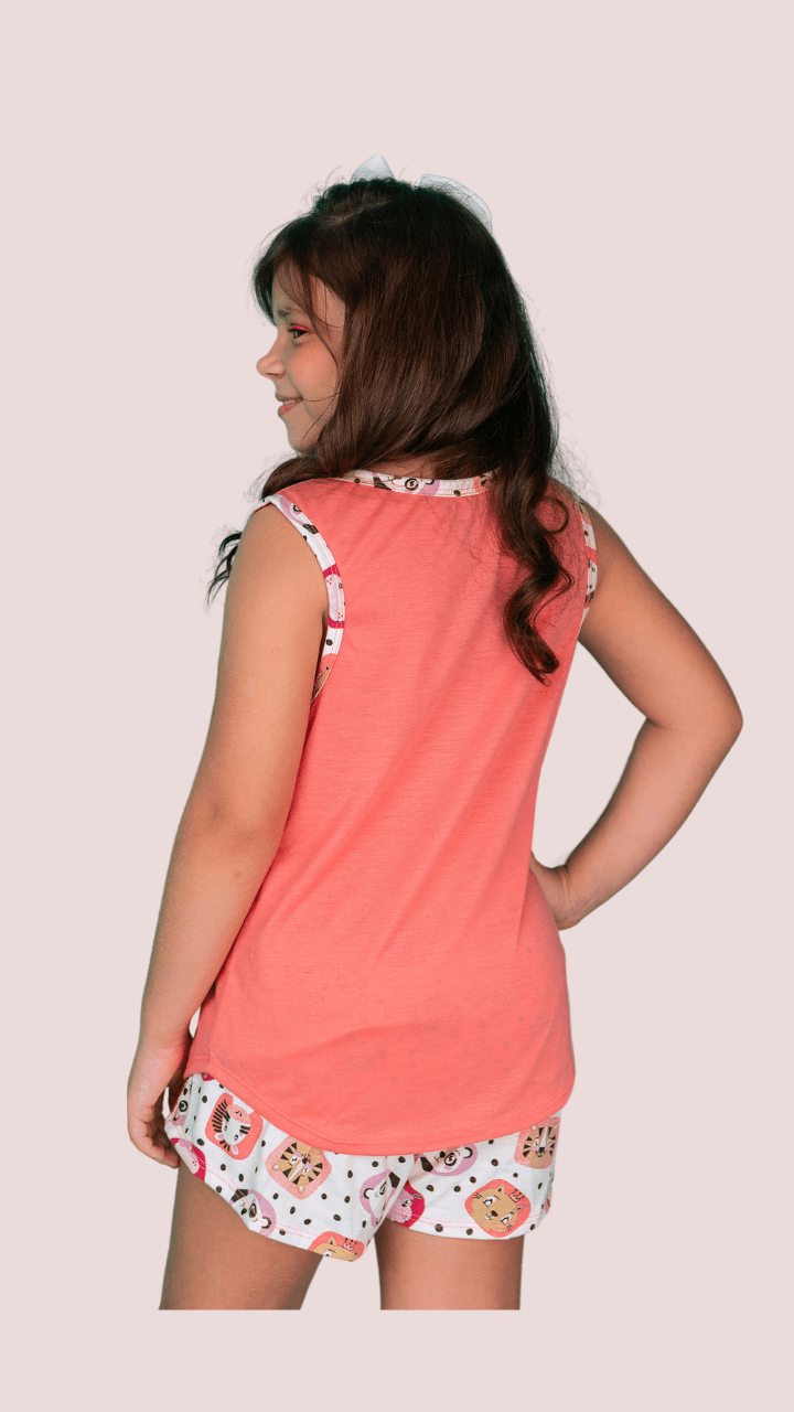 Conjunto de regata e short em tecido PV. Deixe a noite de sono da sua pequena ainda mais aconchegante. Regata com detalhe nos botões Shorts com recortes Combinação de cor lisa e estampa Composição: 65% poliéster, 35% viscose Consulte a cartela de cores/estampa e a tabela de tamanhos disponíveis. Entre em contato com o seu consultor de vendas e finalize o seu pedido!